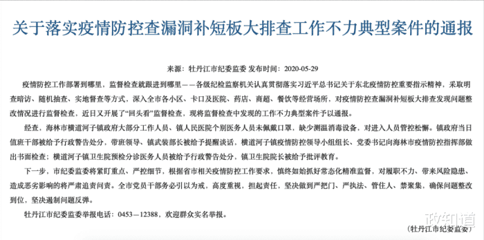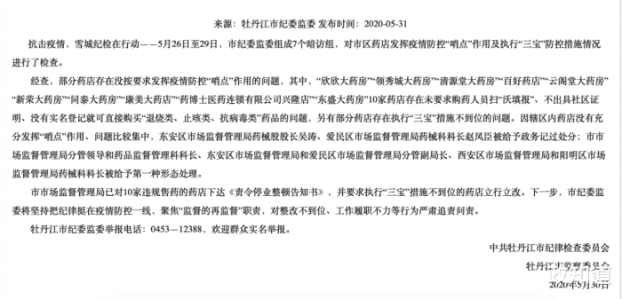 5月30日,牡丹江發(fā)布《關(guān)于市區(qū)藥店發(fā)揮疫情防控“哨點”作用不力典型案件的通報》。